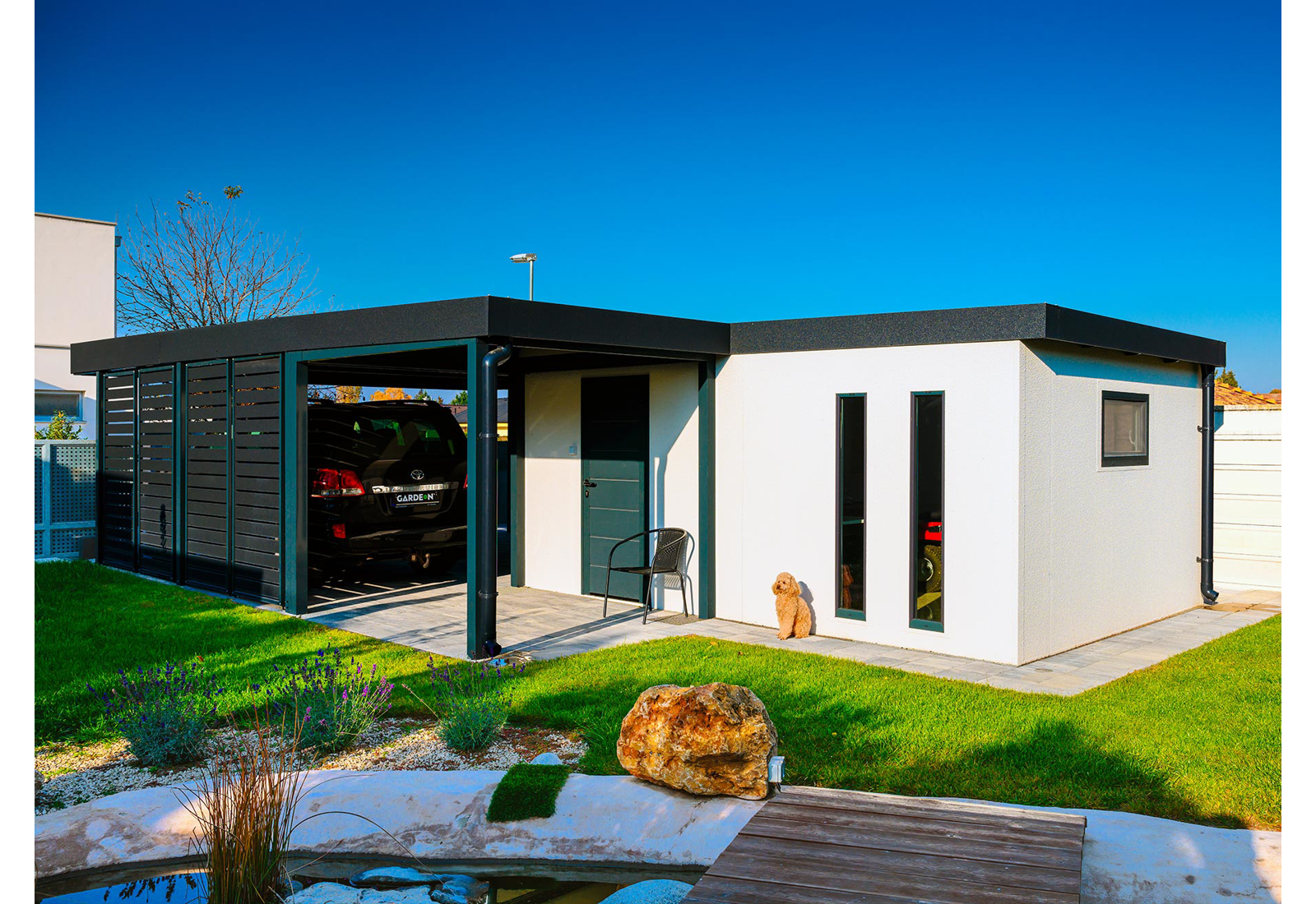 Entdecken Sie die Innovation im Bauwesen – GARDEON® Garagen mit fertigem Designputz der Schweizer Marke KABE. Unsere Garagen bieten Ihnen eine moderne Lösung mit herausragender Qualität und einzigartiger Technologie. Die ganzjährige Fassade aus selbstreinigendem Putz widersteht mühelos Wasser, hohen Temperaturen und allen Wetterbedingungen. Dank der fortschrittlichen Technologie ist die Stahlwand mit nur 5 cm Dicke wesentlich dünner als eine klassische 20 cm dicke Mauerwand – so sparen Sie wertvollen Platz sowohl auf Ihrem Grundstück als auch im Inneren der Garage.