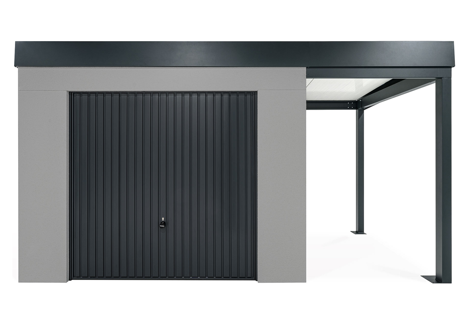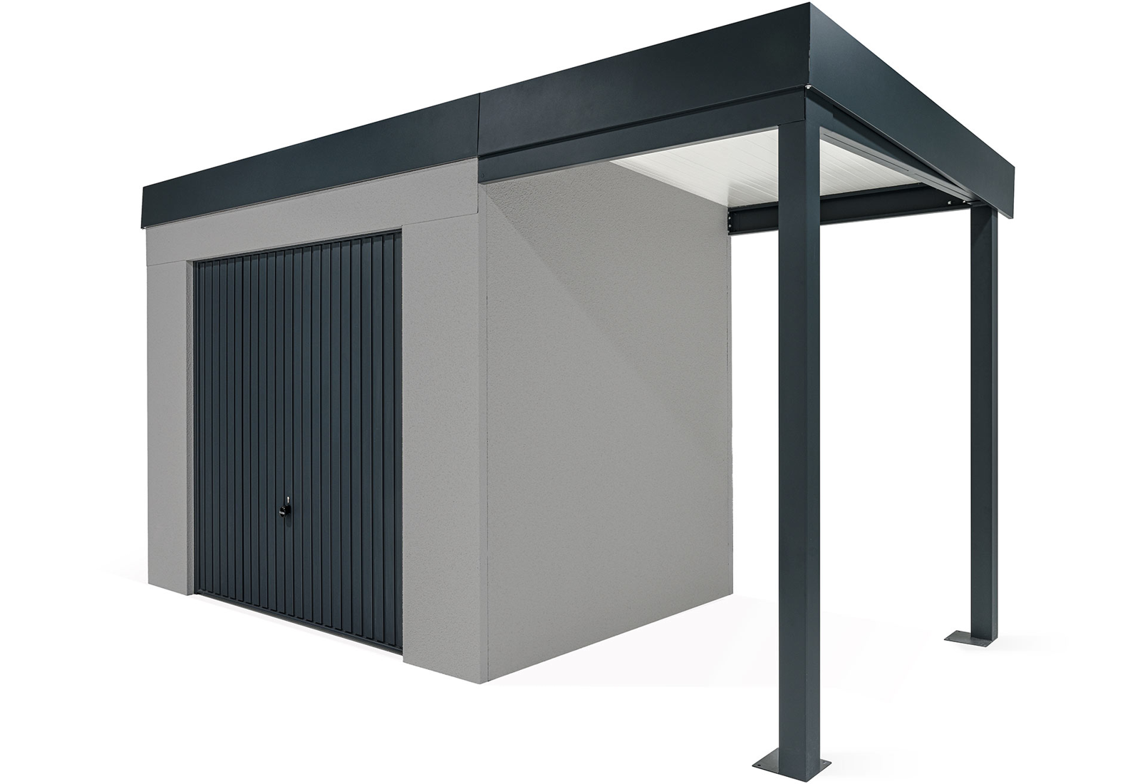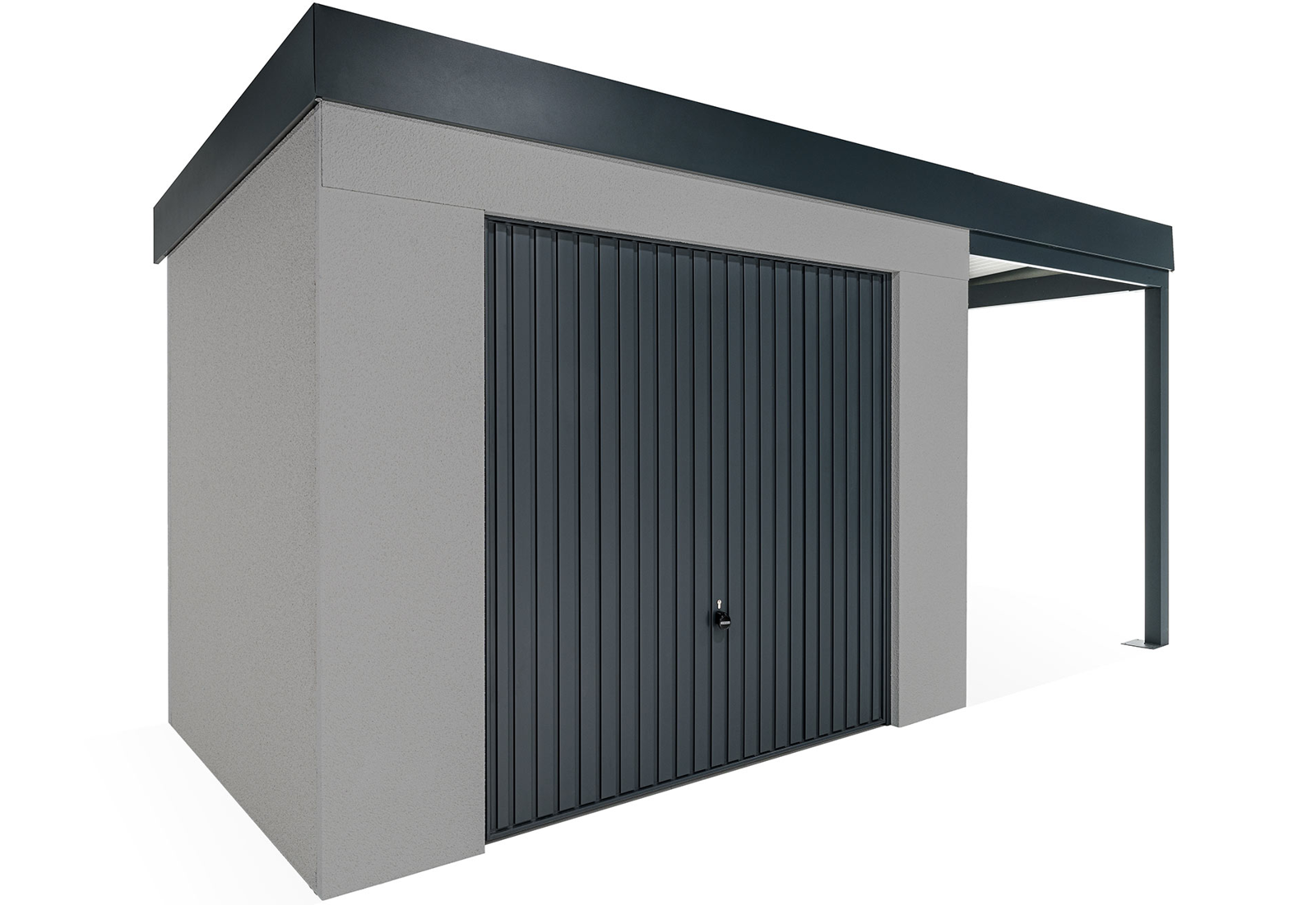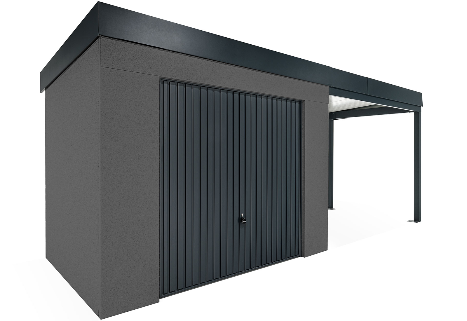 Ihre Traumgarage gibt es wirklich! Ein geräumiges Gartenhaus mit hochwertigen Hörmann-Garagentoren, integrierter Beleuchtung und Solarbetrieb. Die segmentierten Torflügel falten sich nach innen und sparen so Platz. Das extrem leise Öffnen und Schließen der Tore ist ein zusätzlicher Bonus.