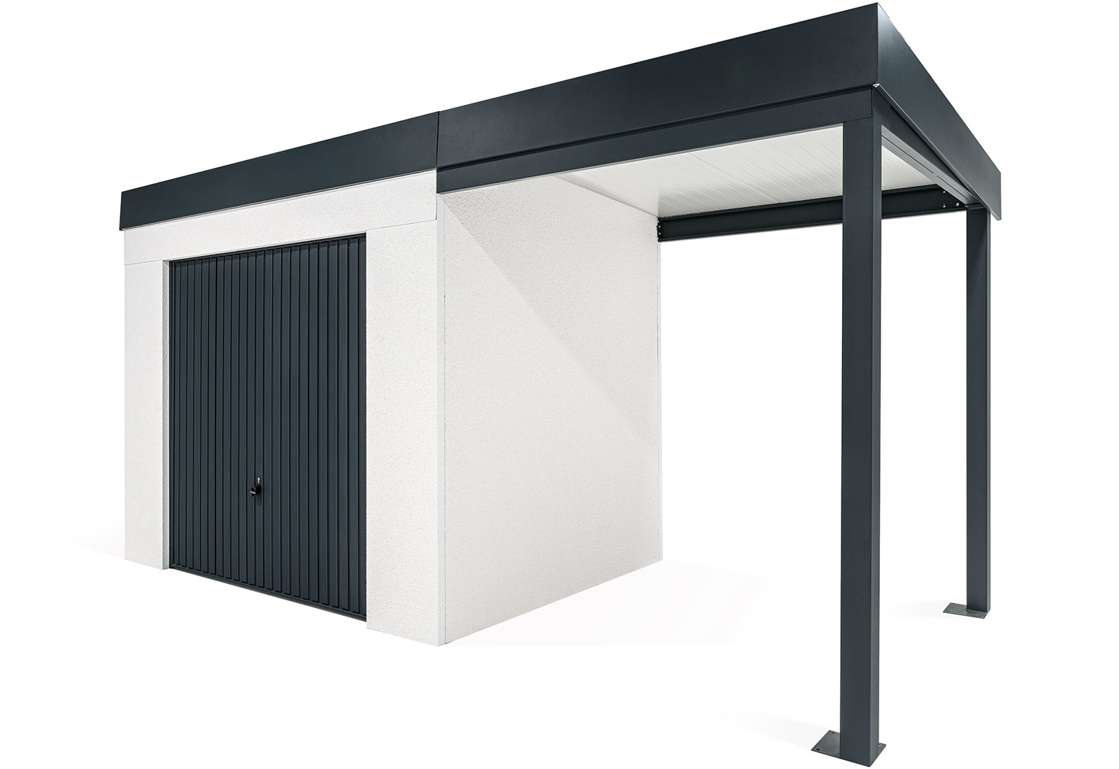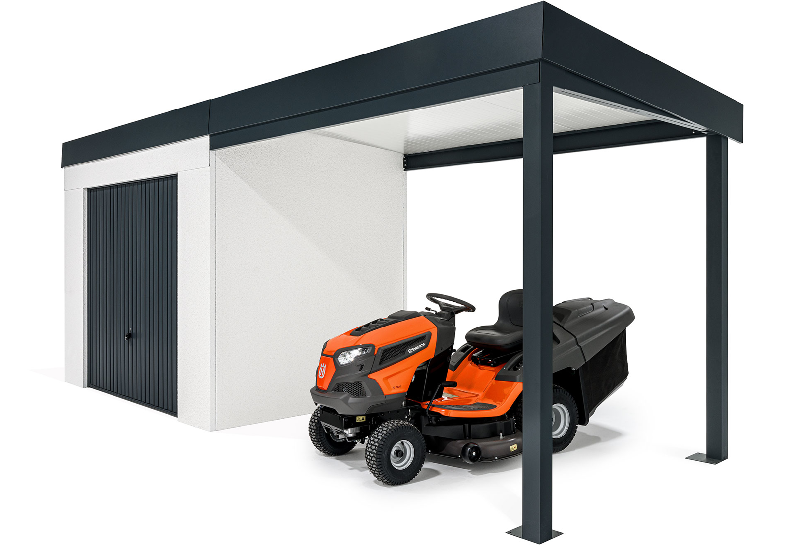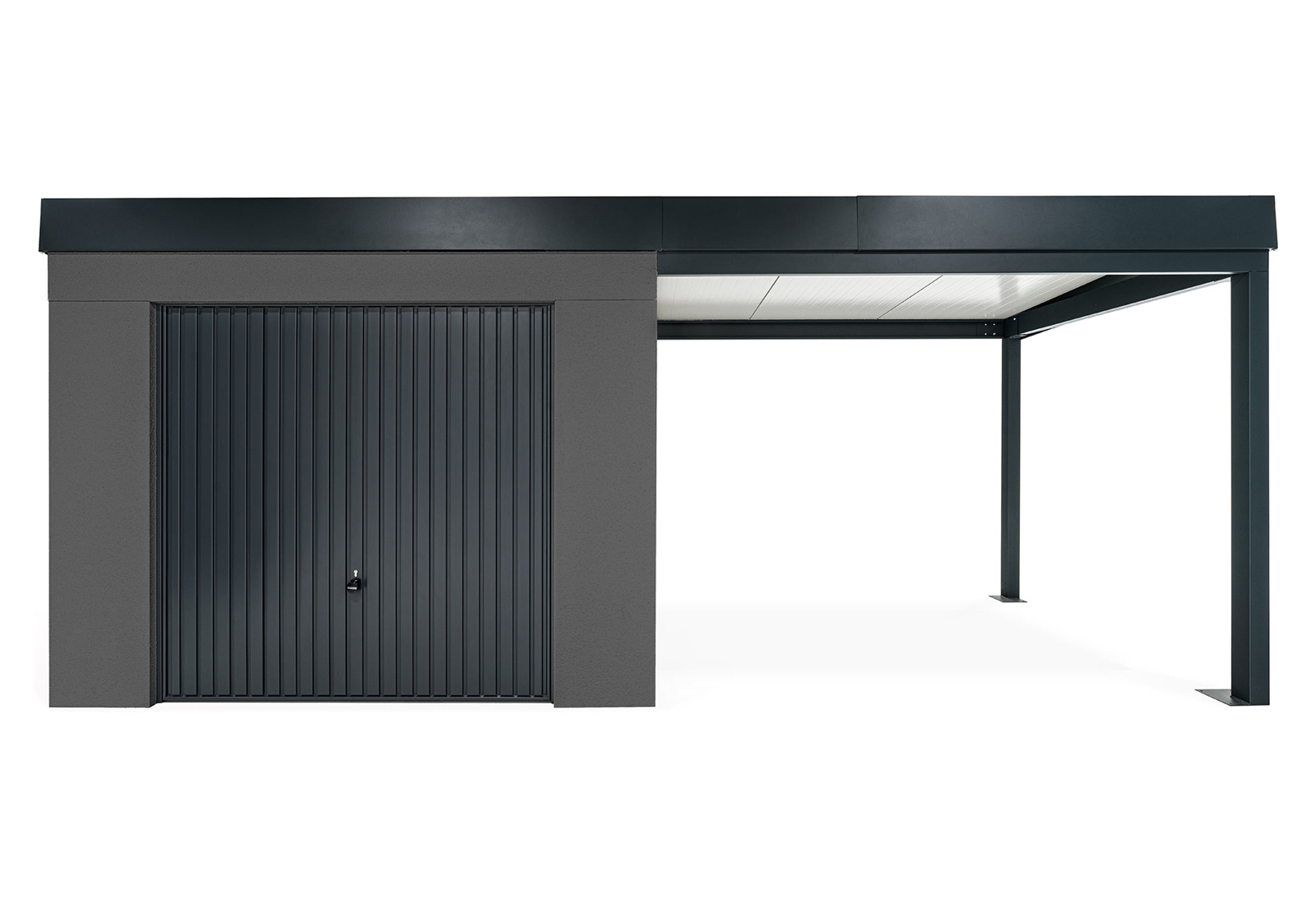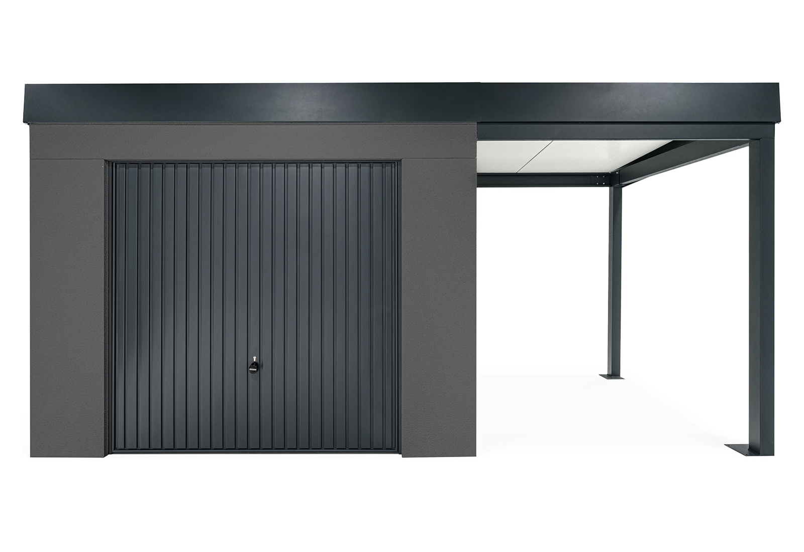 Ihre Traumgarage gibt es wirklich! Ein geräumiges Gartenhaus mit hochwertigen Hörmann-Garagentoren, integrierter Beleuchtung und Solarbetrieb. Die segmentierten Torflügel falten sich nach innen und sparen so Platz. Das extrem leise Öffnen und Schließen der Tore ist ein zusätzlicher Bonus.