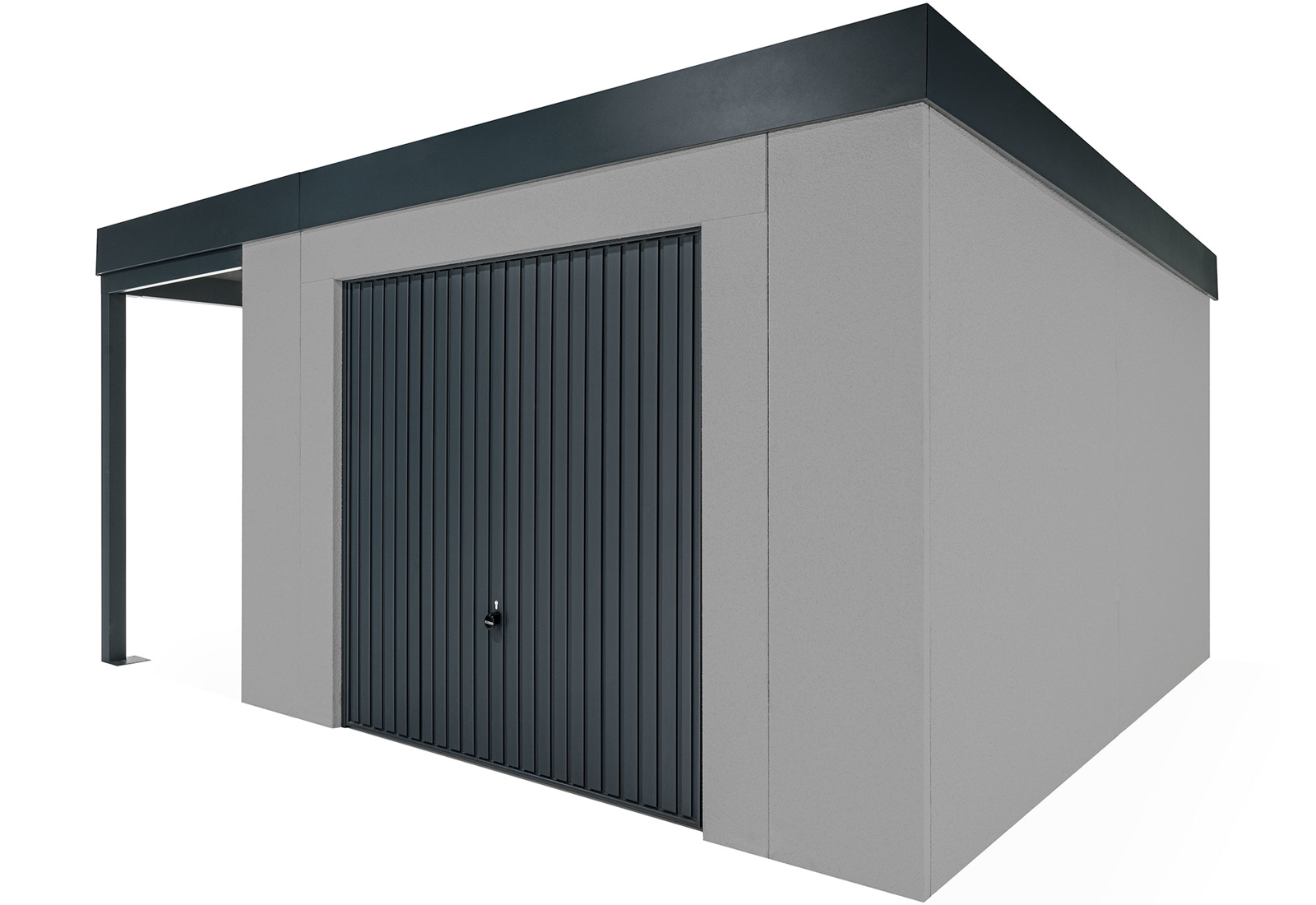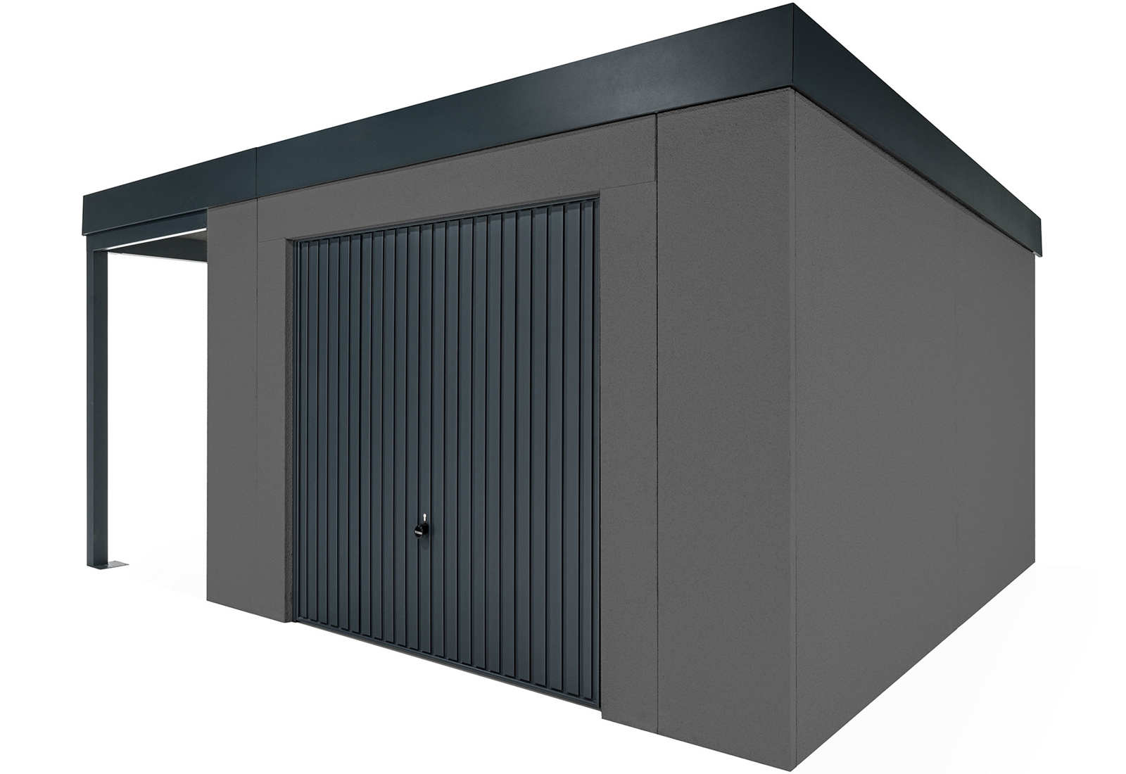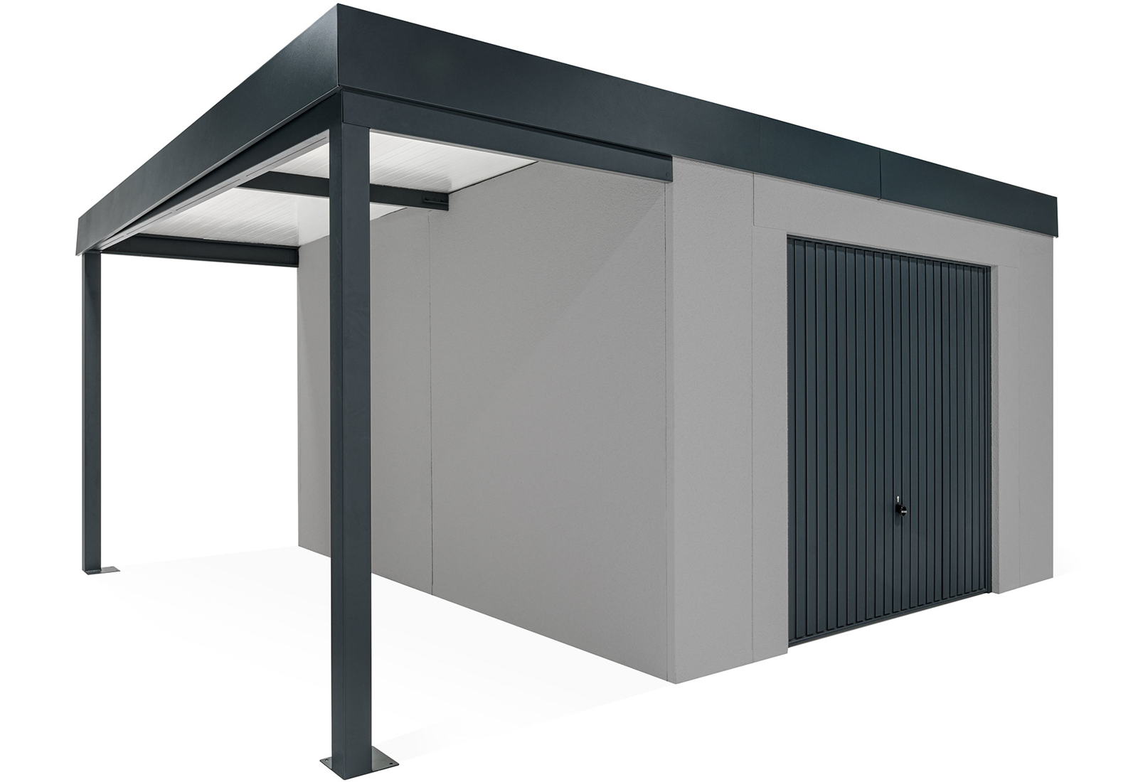 Ihre Traumgarage gibt es wirklich! Ein geräumiges Gartenhaus mit hochwertigen Hörmann-Garagentoren, integrierter Beleuchtung und Solarbetrieb. Die segmentierten Torflügel falten sich nach innen und sparen so Platz. Das extrem leise Öffnen und Schließen der Tore ist ein zusätzlicher Bonus.