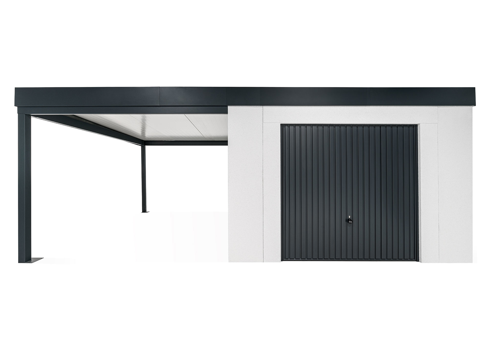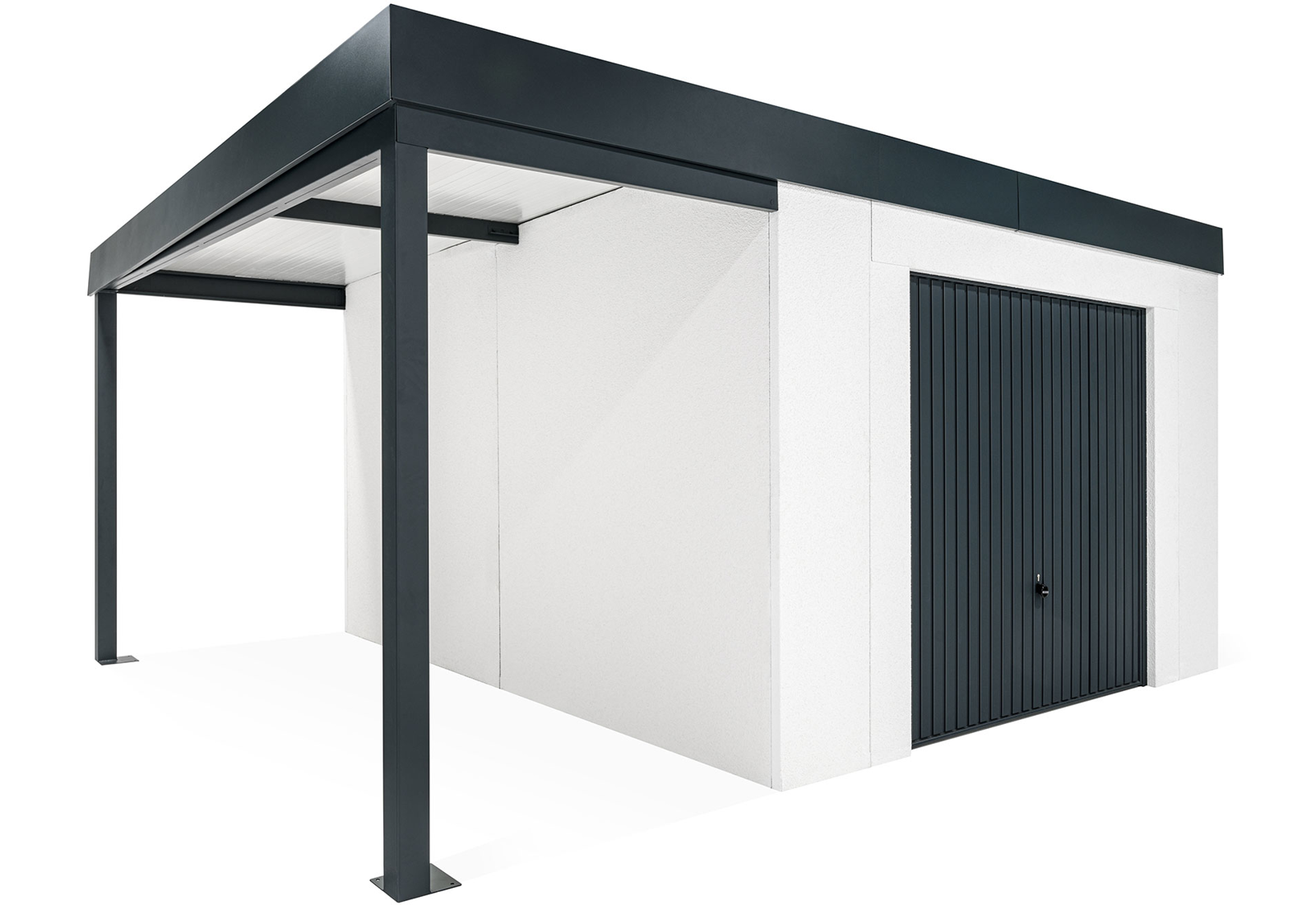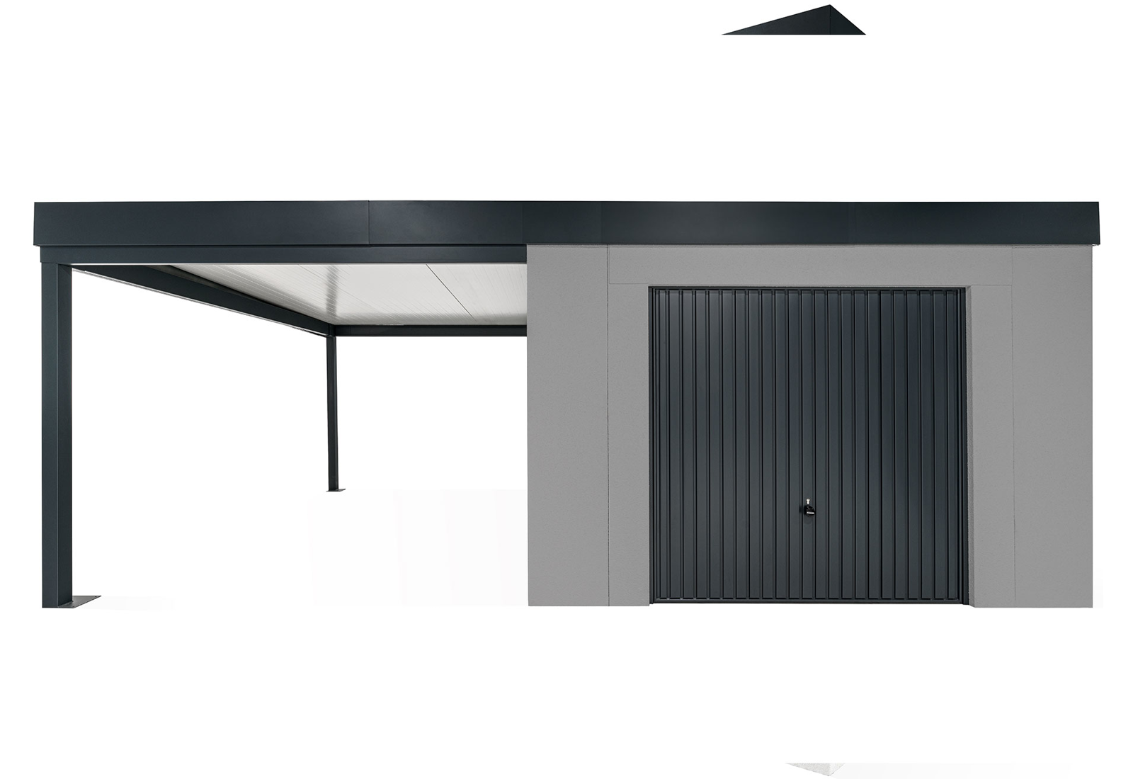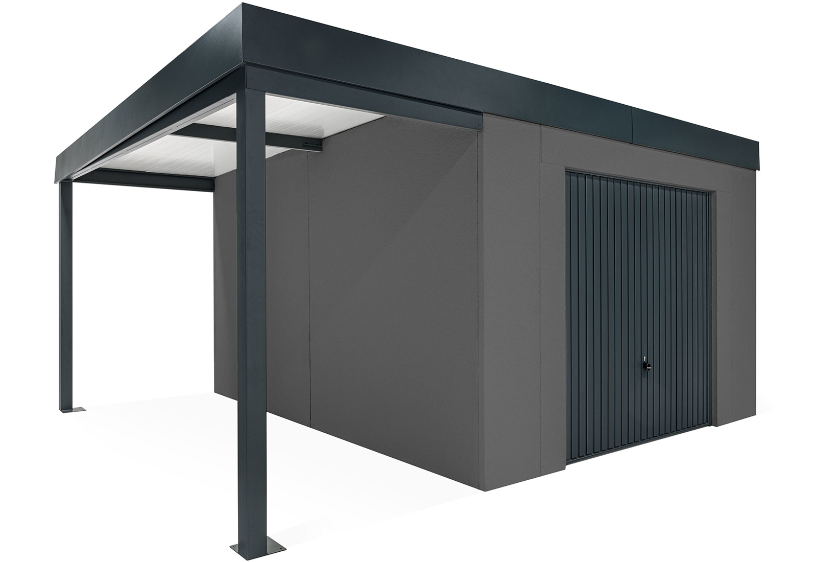 Ihre Traumgarage gibt es wirklich! Ein geräumiges Gartenhaus mit hochwertigen Hörmann-Garagentoren, integrierter Beleuchtung und Solarbetrieb. Die segmentierten Torflügel falten sich nach innen und sparen so Platz. Das extrem leise Öffnen und Schließen der Tore ist ein zusätzlicher Bonus.