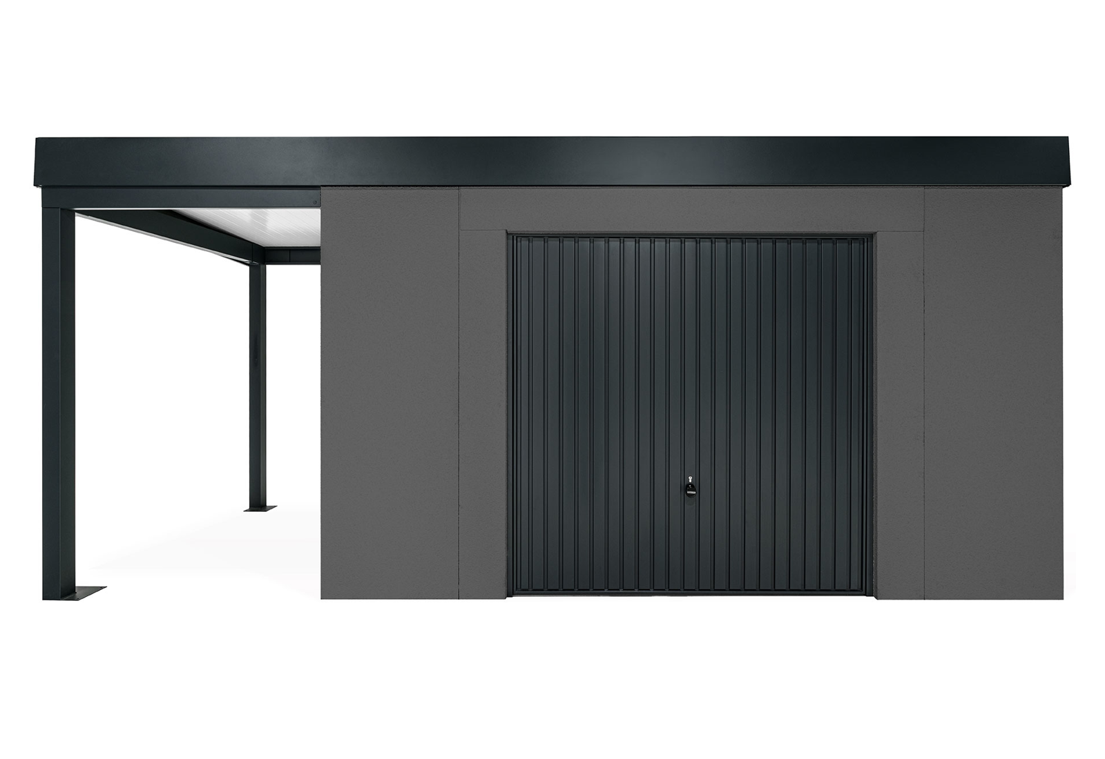 Ihre Traumgarage gibt es wirklich! Ein geräumiges Gartenhaus mit hochwertigen Hörmann-Garagentoren, integrierter Beleuchtung und Solarbetrieb. Die segmentierten Torflügel falten sich nach innen und sparen so Platz. Das extrem leise Öffnen und Schließen der Tore ist ein zusätzlicher Bonus.
