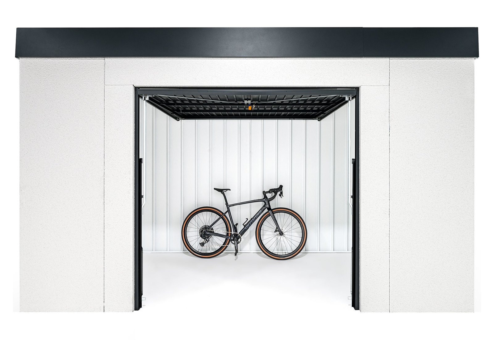 Ihre Traumgarage gibt es wirklich! Ein geräumiges Gartenhaus mit hochwertigen Hörmann-Garagentoren, integrierter Beleuchtung und Solarbetrieb. Die segmentierten Torflügel falten sich nach innen und sparen so Platz. Das extrem leise Öffnen und Schließen der Tore ist ein zusätzlicher Bonus.
