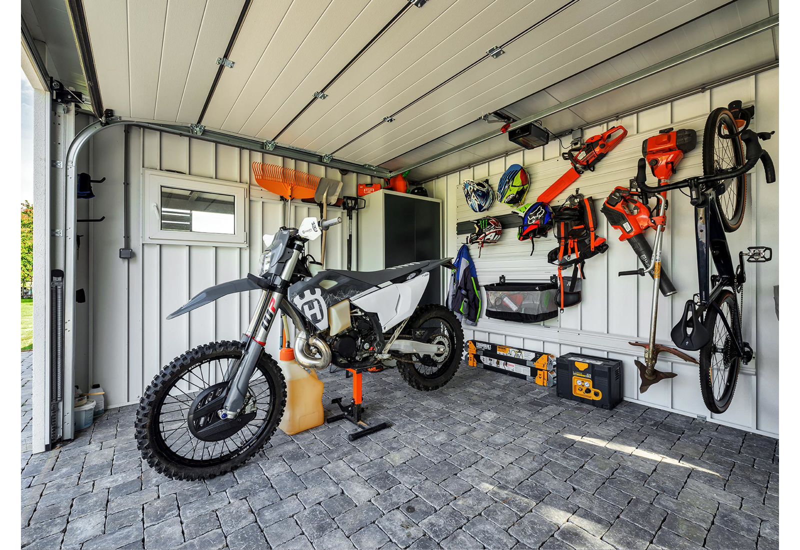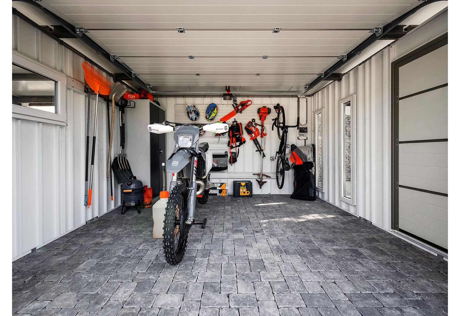 Ihre Traumgarage gibt es wirklich! Ein geräumiges Gartenhaus mit hochwertigen Hörmann-Garagentoren, integrierter Beleuchtung und Solarbetrieb. Die segmentierten Torflügel falten sich nach innen und sparen so Platz. Das extrem leise Öffnen und Schließen der Tore ist ein zusätzlicher Bonus.