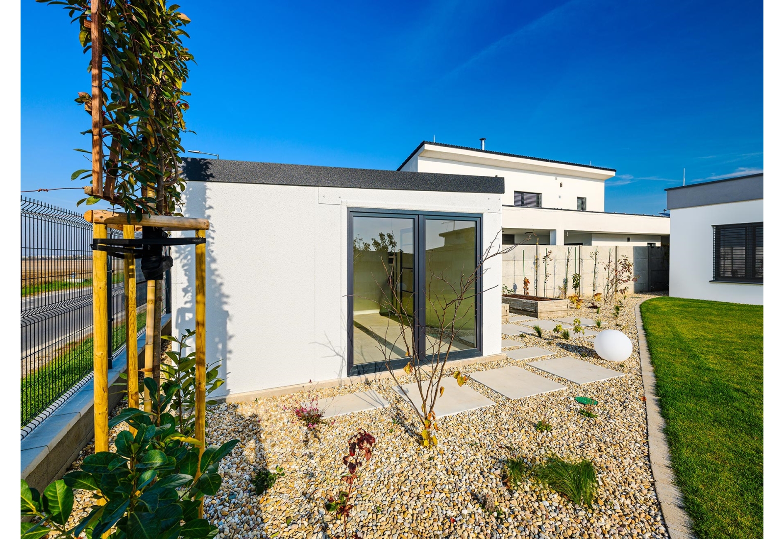 Entdecken Sie Innovation im Bauwesen – die montierten Gartenhäuser von GARDEON® mit fertigem Designputz der Schweizer Marke KABE. Die ganzjährige, selbstreinigende Fassade widersteht mühelos Wasser, hohen Temperaturen und allen Witterungsbedingungen. Dank unserer einzigartigen Technologie beträgt die Dicke der Stahlwand nur 5 cm – im Vergleich zu einer 20 cm dicken klassischen Mauerwand spart das wertvollen Platz in Ihrem Garten und im Innenraum des Gartenhauses.