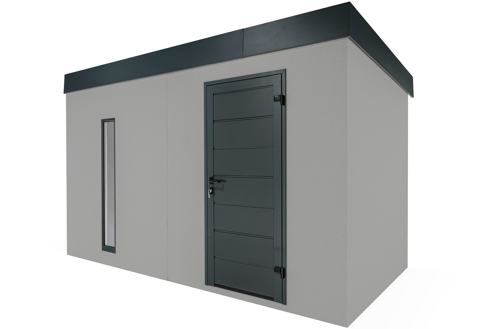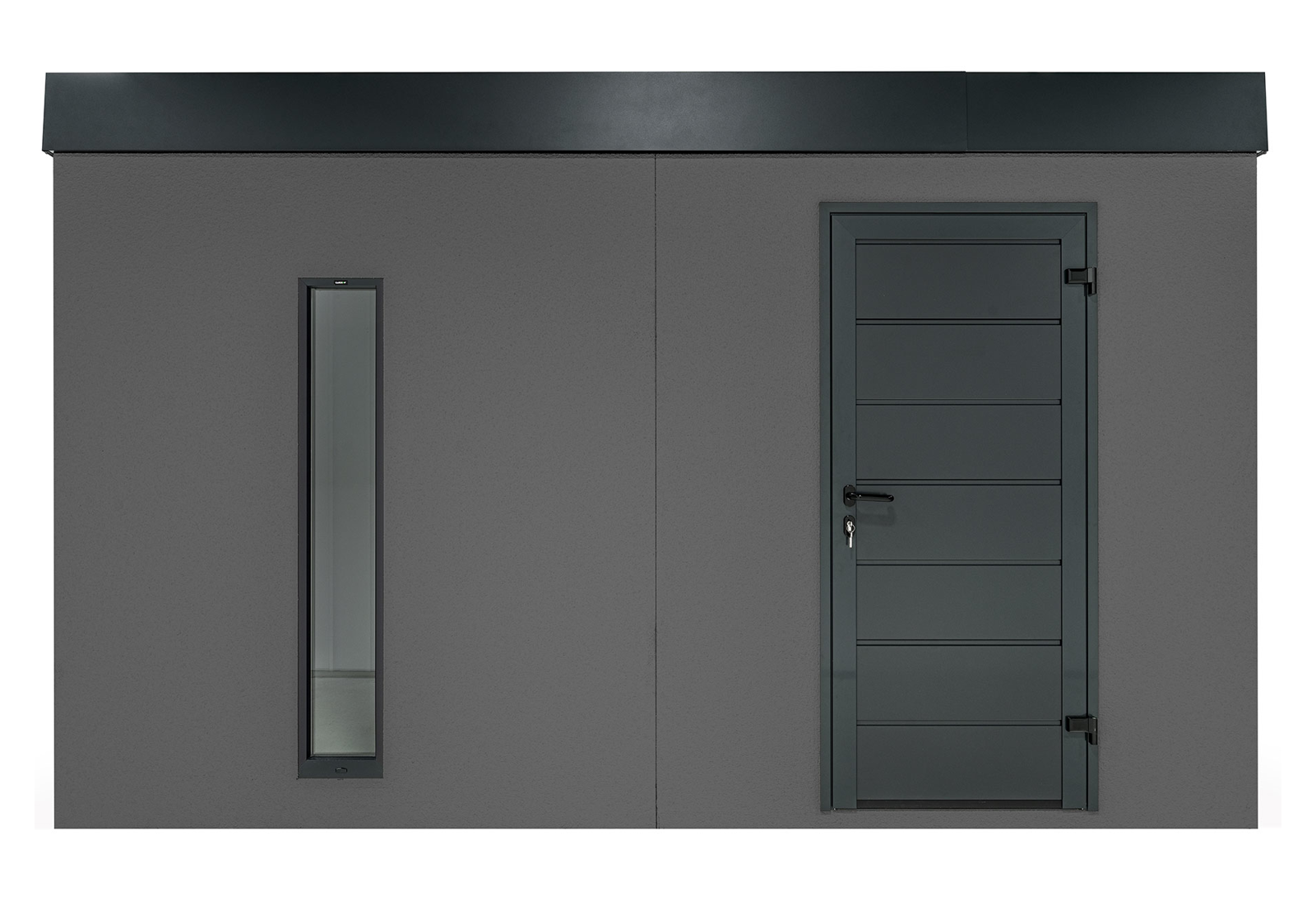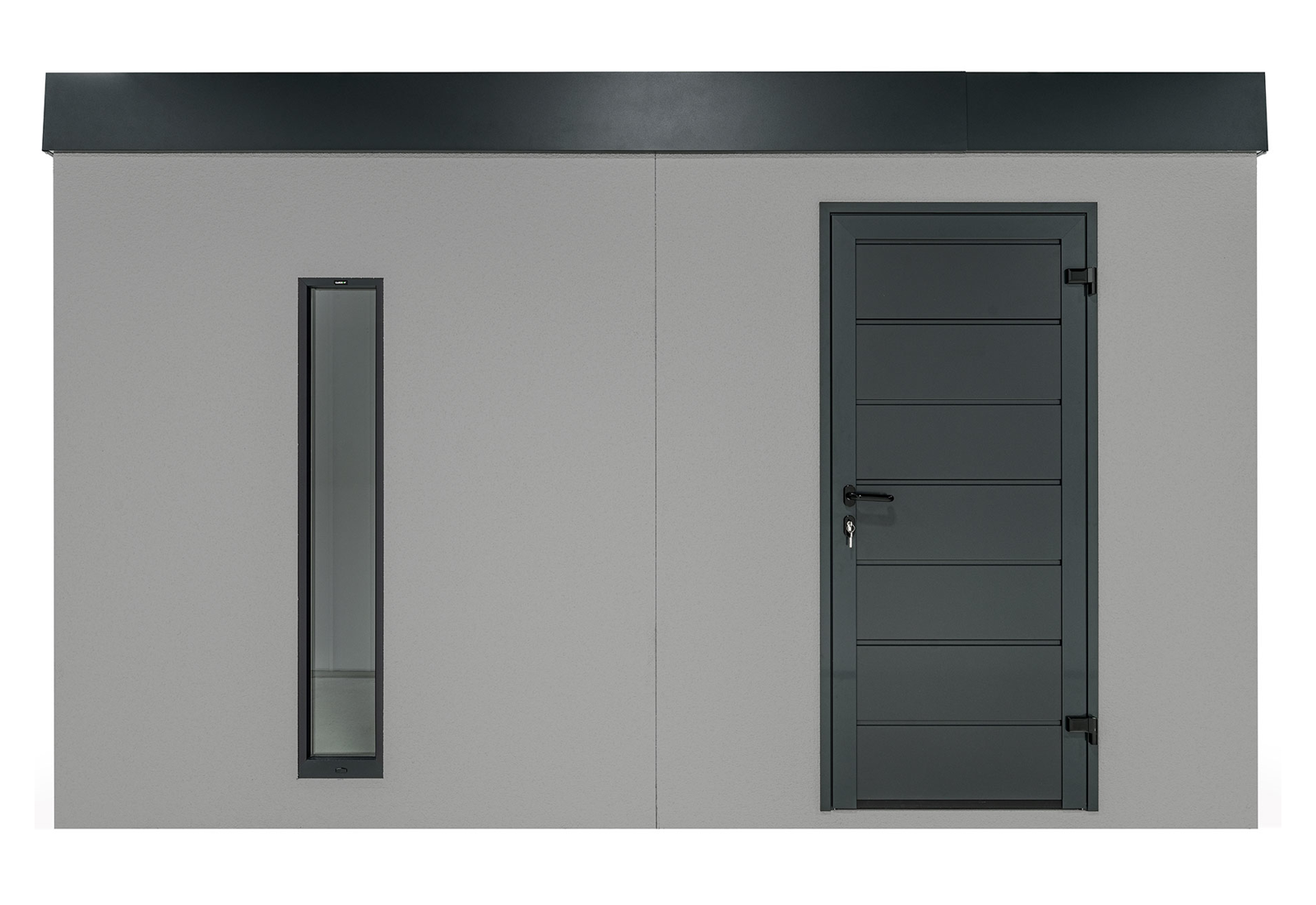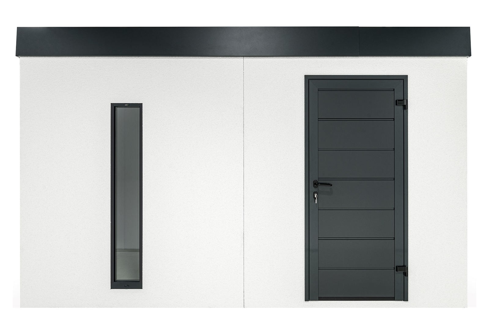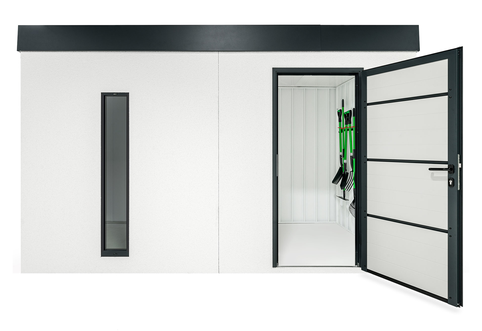 Ein Gartenhaus kann auch ohne herkömmliche Fenster lichtdurchflutet sein. Vertikale Kunststoff-Lichtband-Fenster mit Doppelverglasung bieten eine hervorragende Beleuchtungslösung. Der optimale Abstand von 20 cm zwischen den Lichtbändern sorgt für eine ausgewogene Balance von Licht und Schatten im großzügigen Innenraum