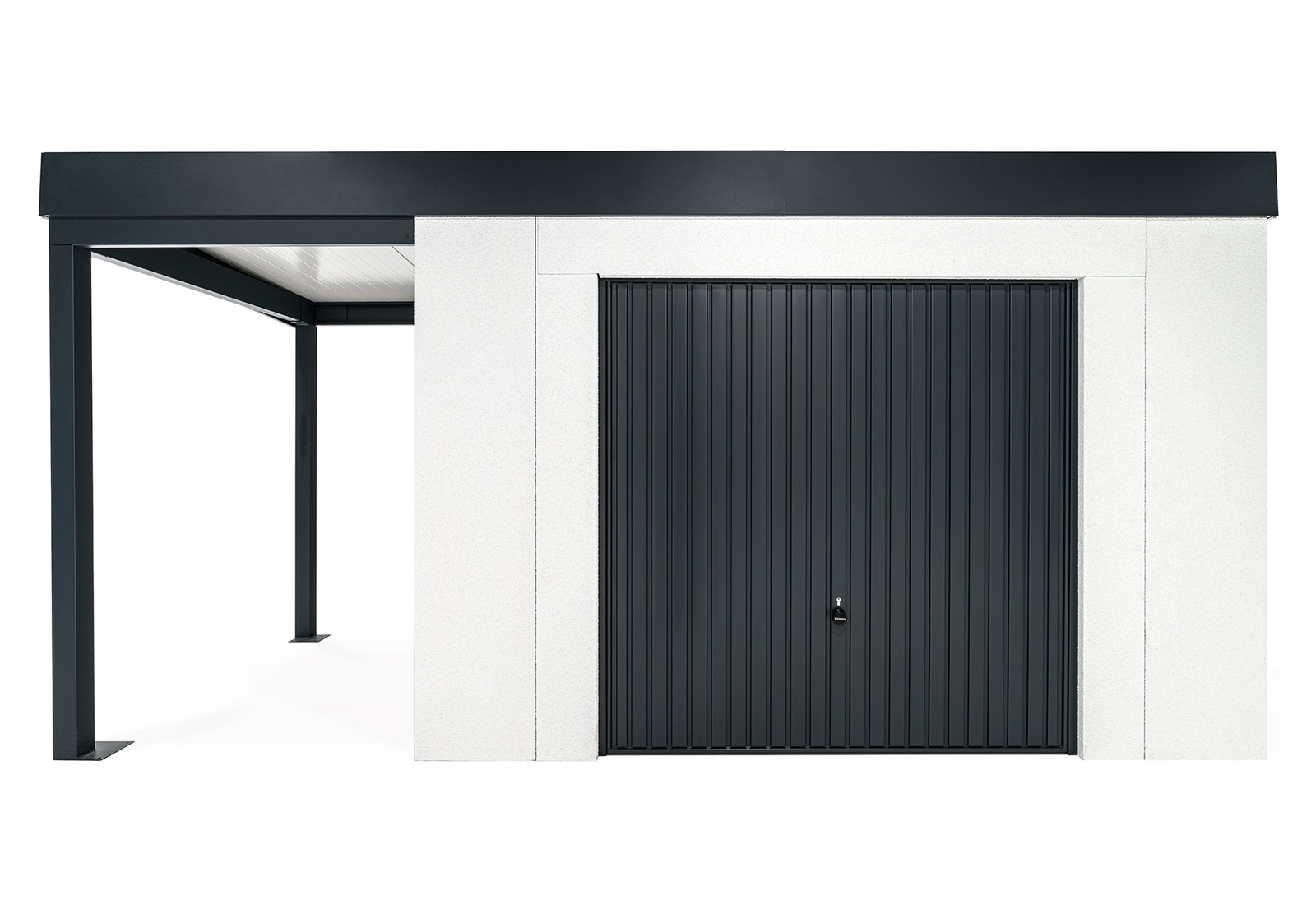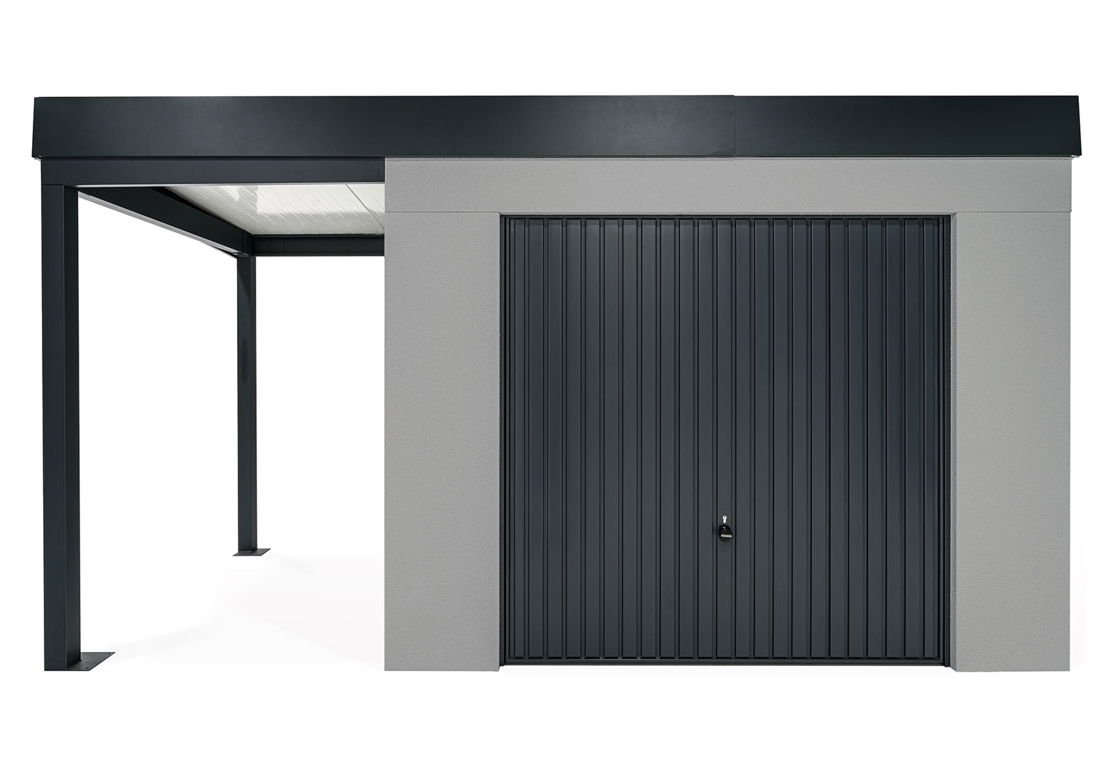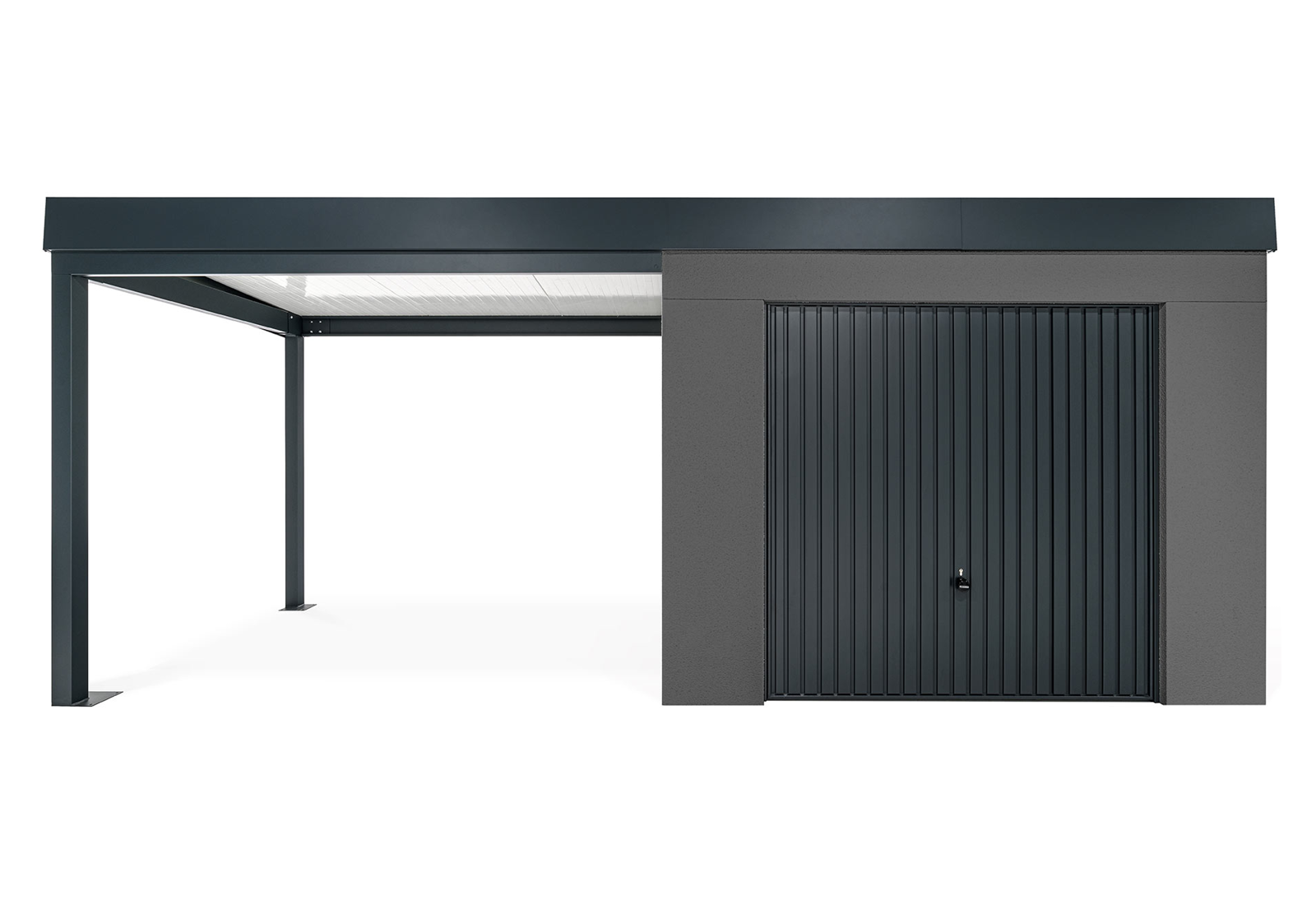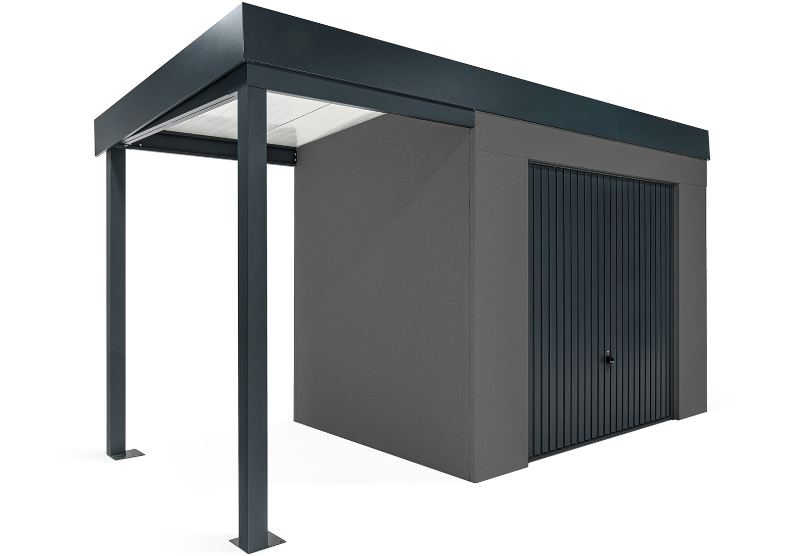 Ihre Traumgarage gibt es wirklich! Ein geräumiges Gartenhaus mit hochwertigen Hörmann-Garagentoren, integrierter Beleuchtung und Solarbetrieb. Die segmentierten Torflügel falten sich nach innen und sparen so Platz. Das extrem leise Öffnen und Schließen der Tore ist ein zusätzlicher Bonus.