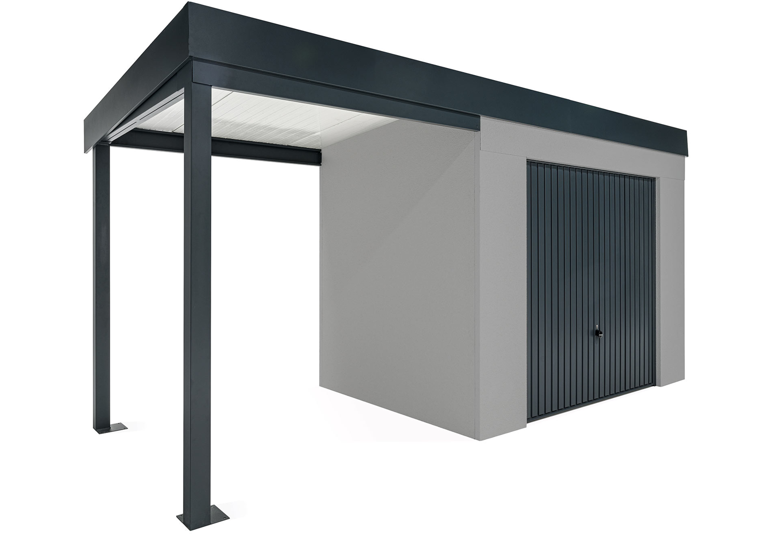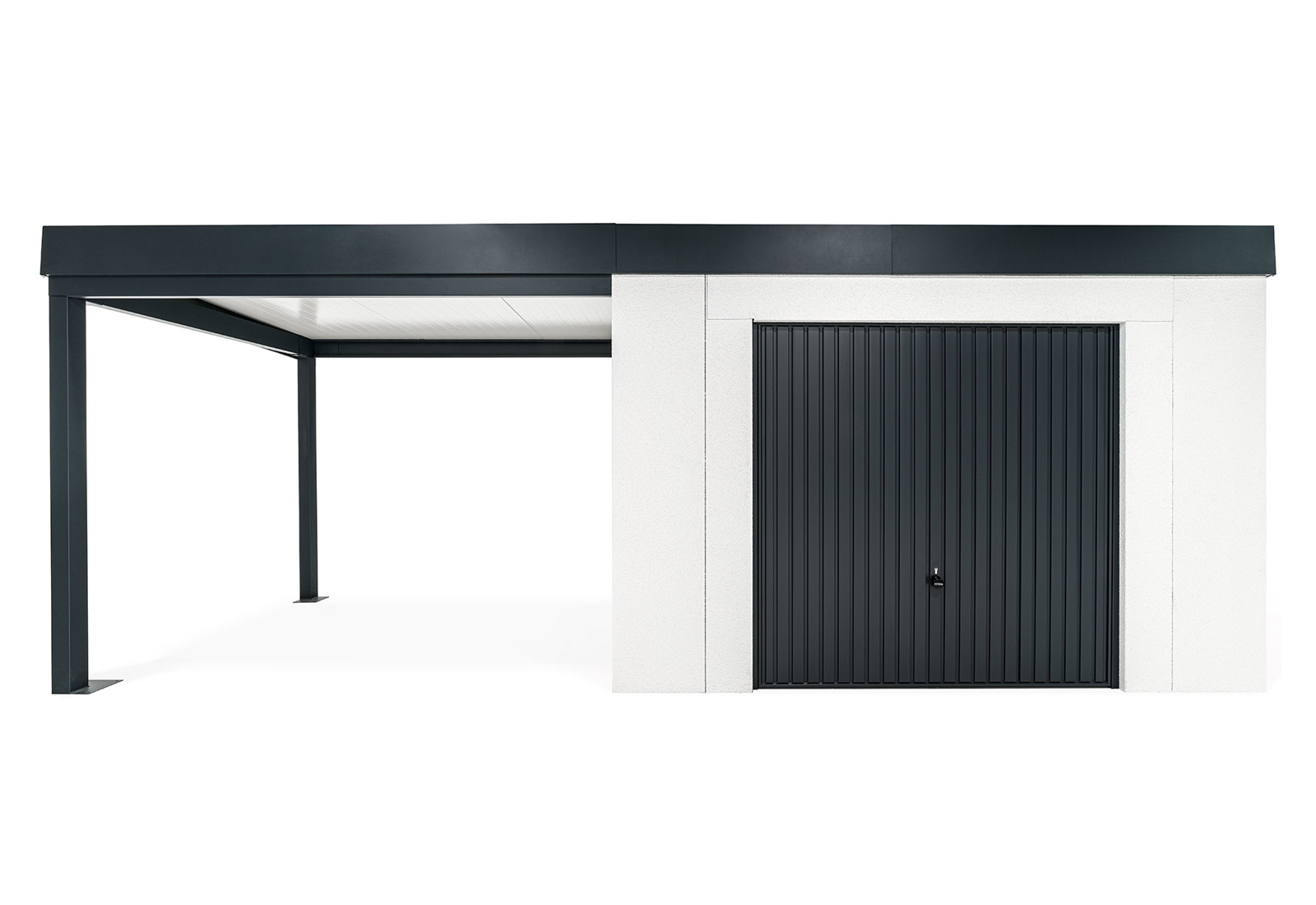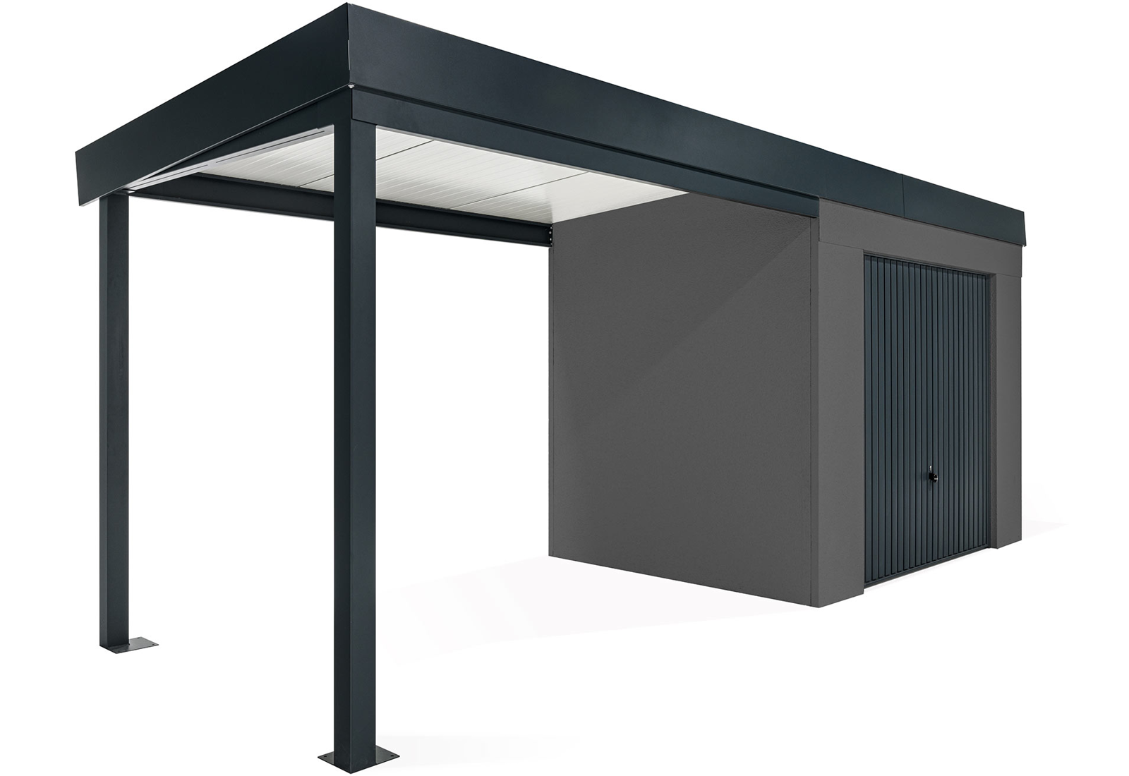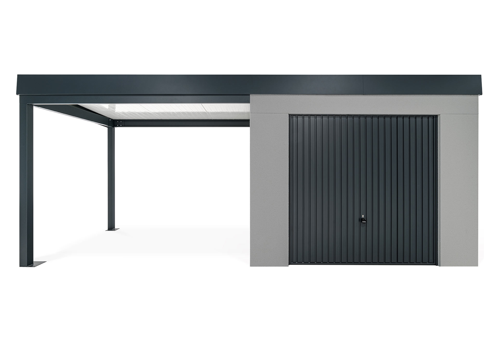 Ihre Traumgarage gibt es wirklich! Ein geräumiges Gartenhaus mit hochwertigen Hörmann-Garagentoren, integrierter Beleuchtung und Solarbetrieb. Die segmentierten Torflügel falten sich nach innen und sparen so Platz. Das extrem leise Öffnen und Schließen der Tore ist ein zusätzlicher Bonus.