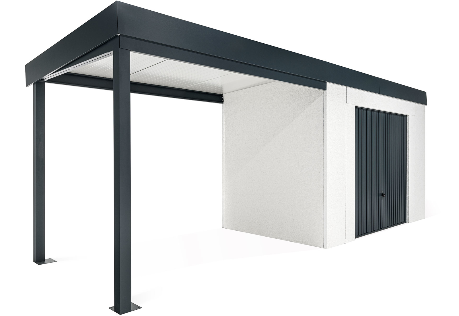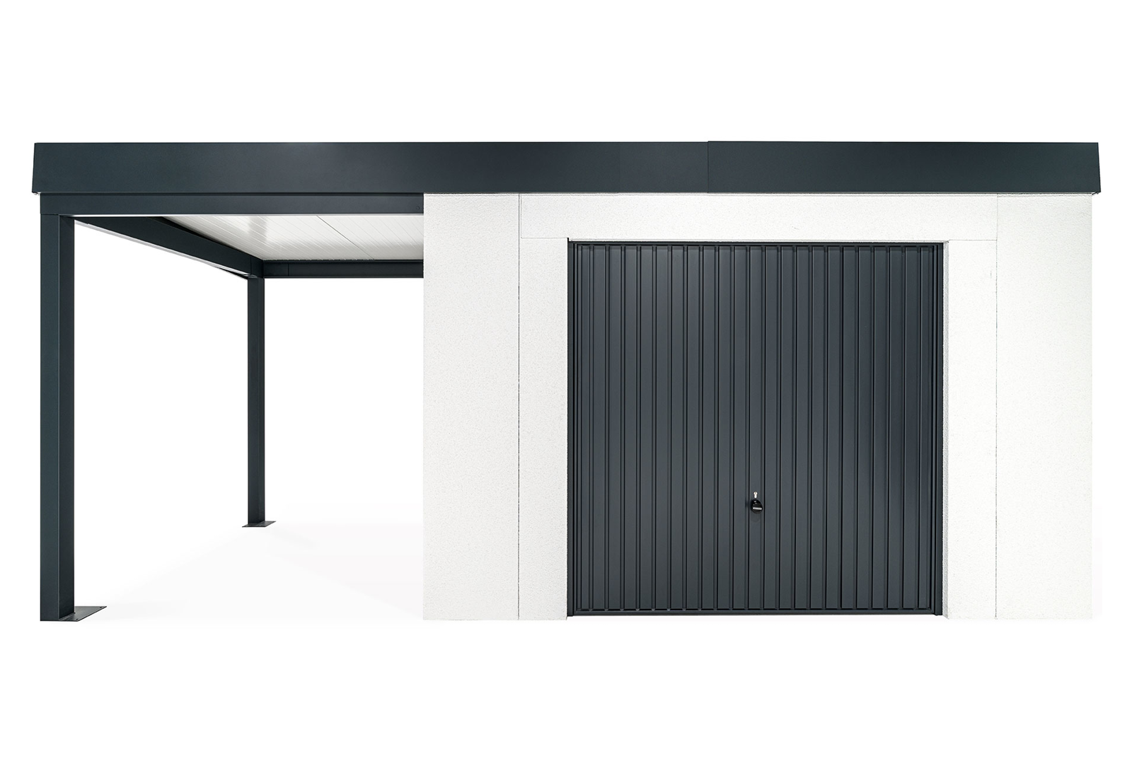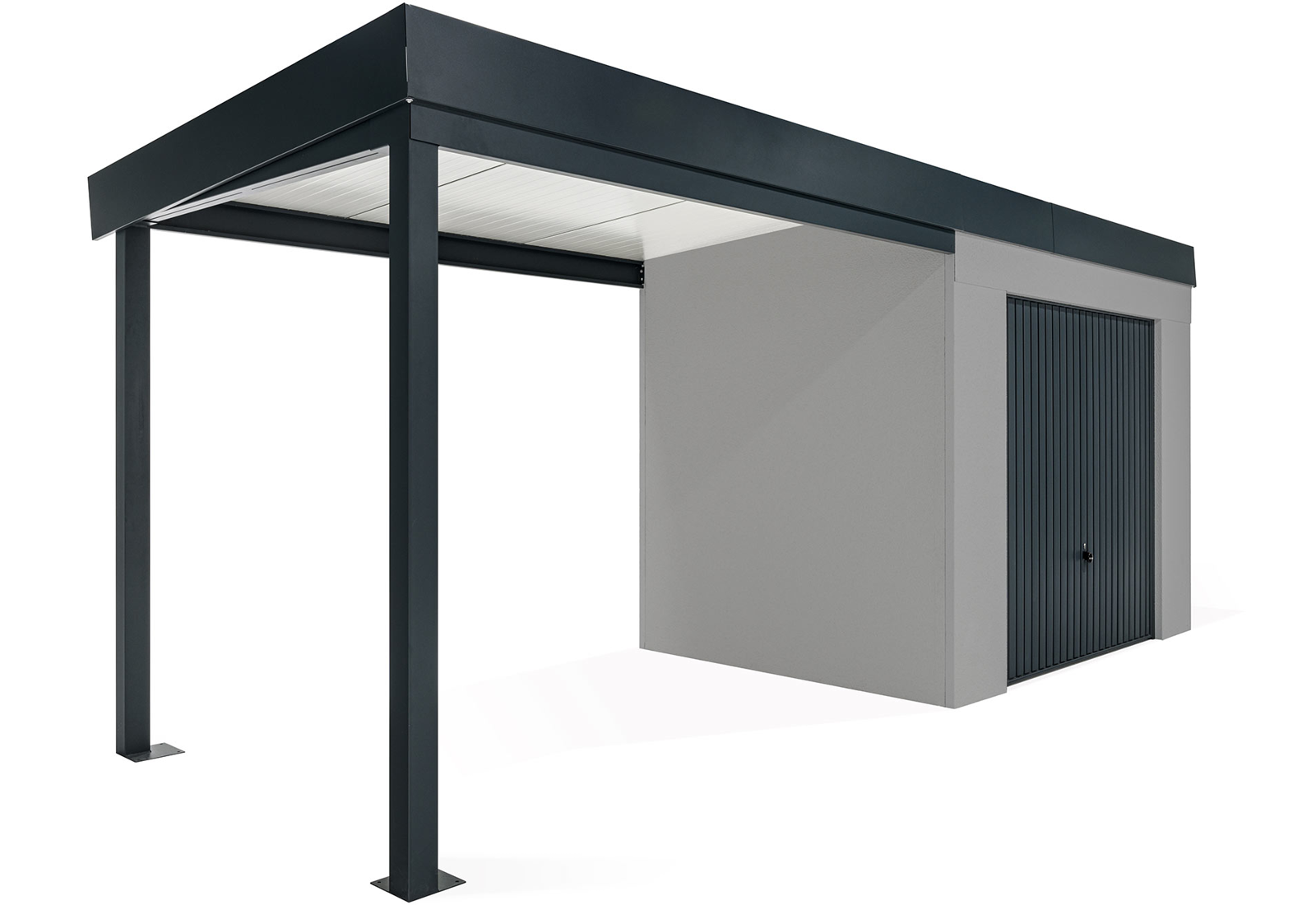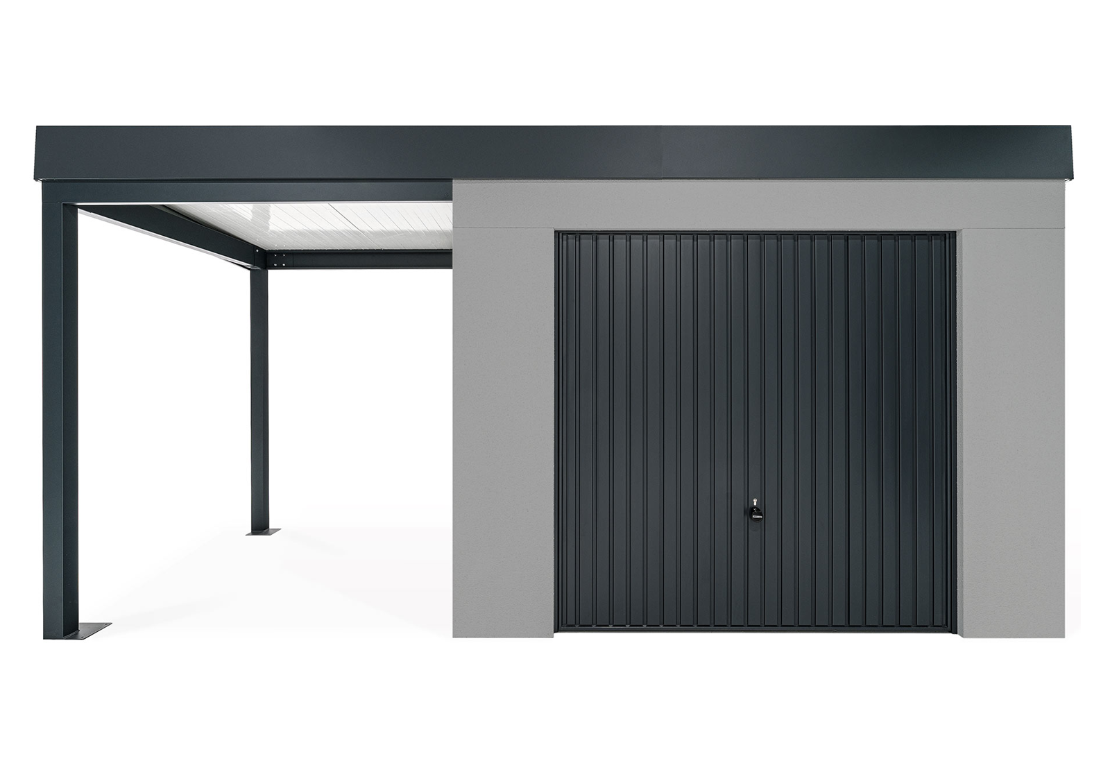Ihre Traumgarage gibt es wirklich! Ein geräumiges Gartenhaus mit hochwertigen Hörmann-Garagentoren, integrierter Beleuchtung und Solarbetrieb. Die segmentierten Torflügel falten sich nach innen und sparen so Platz. Das extrem leise Öffnen und Schließen der Tore ist ein zusätzlicher Bonus.