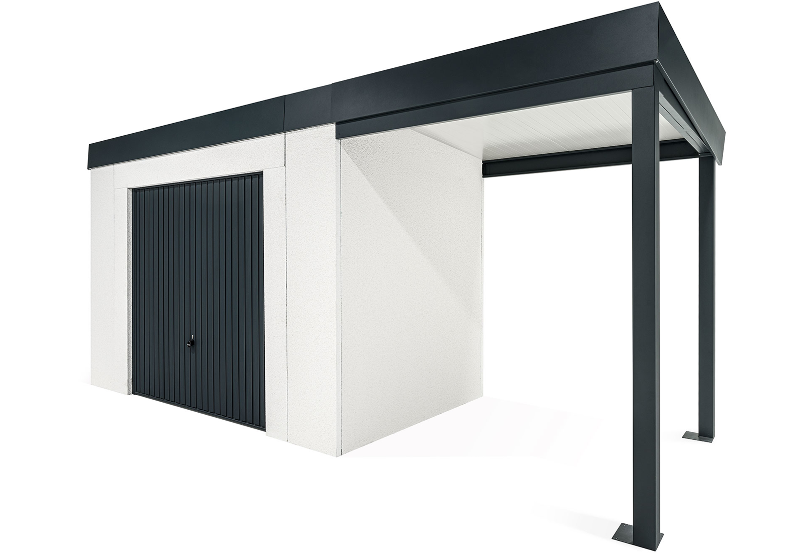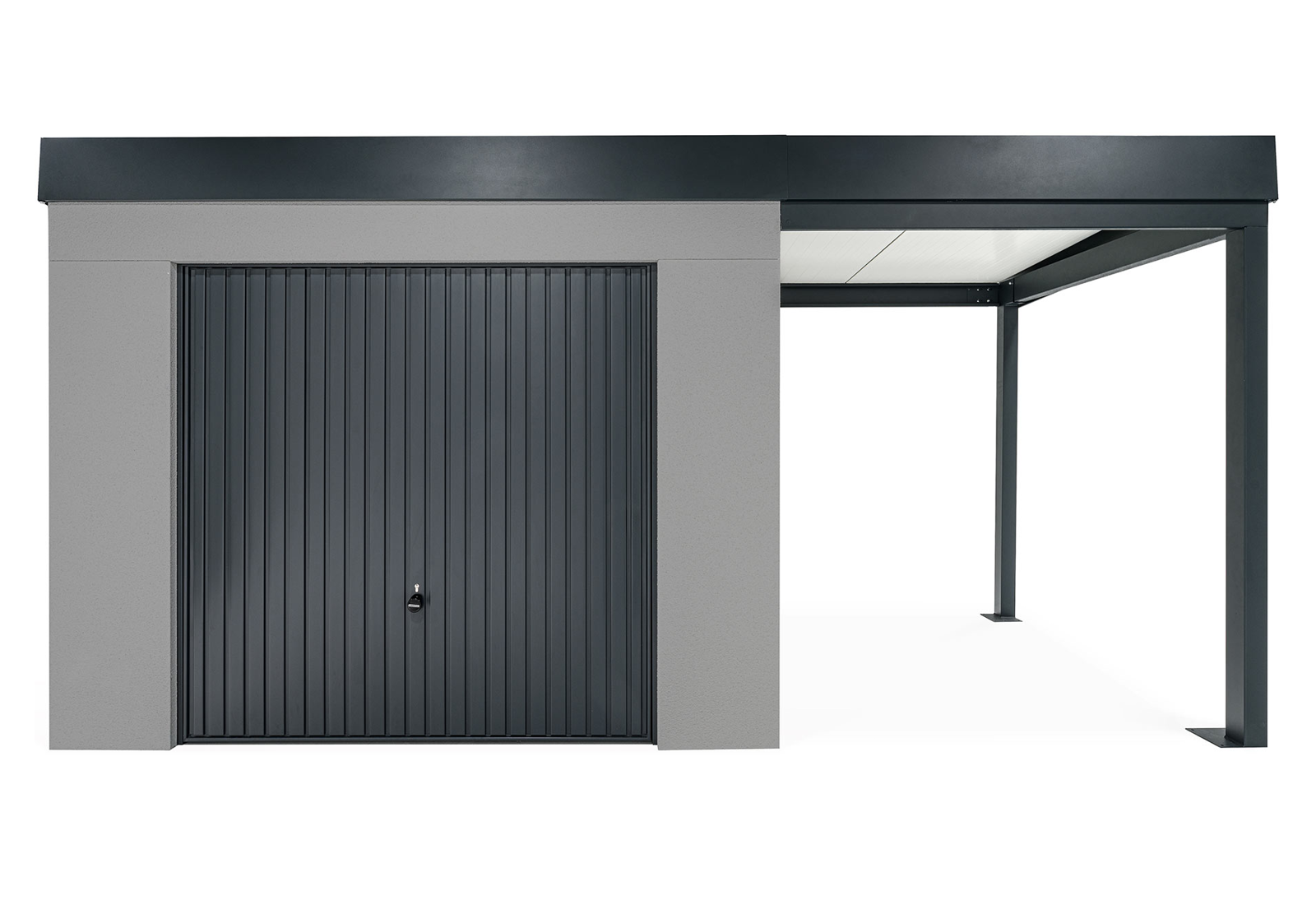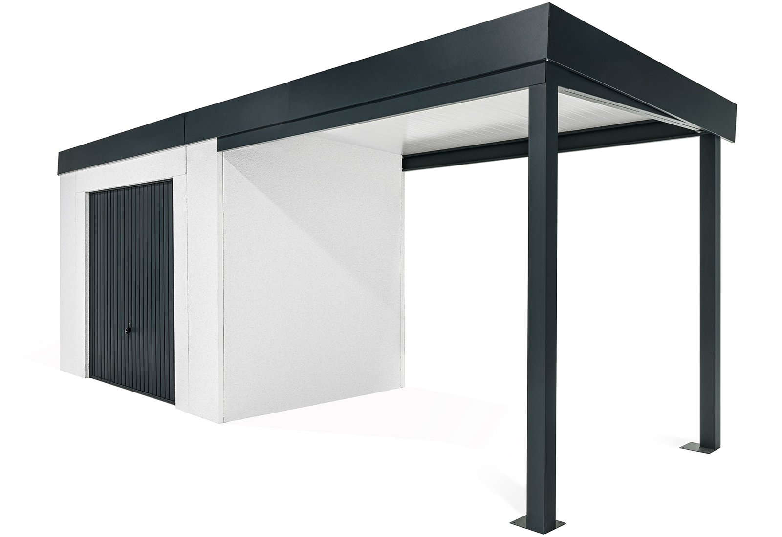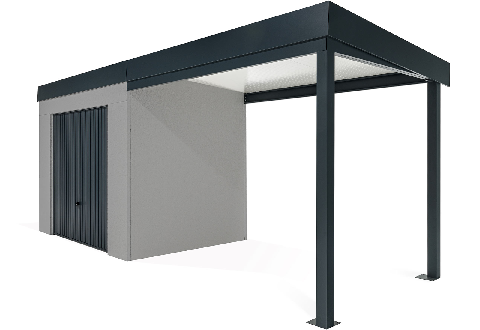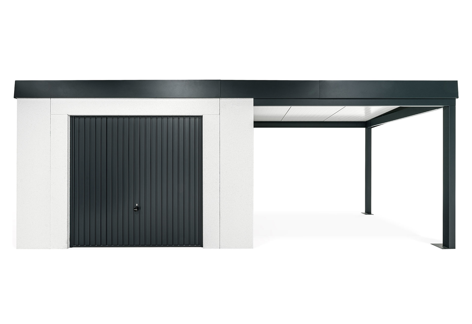Ihre Traumgarage gibt es wirklich! Ein geräumiges Gartenhaus mit hochwertigen Hörmann-Garagentoren, integrierter Beleuchtung und Solarbetrieb. Die segmentierten Torflügel falten sich nach innen und sparen so Platz. Das extrem leise Öffnen und Schließen der Tore ist ein zusätzlicher Bonus.