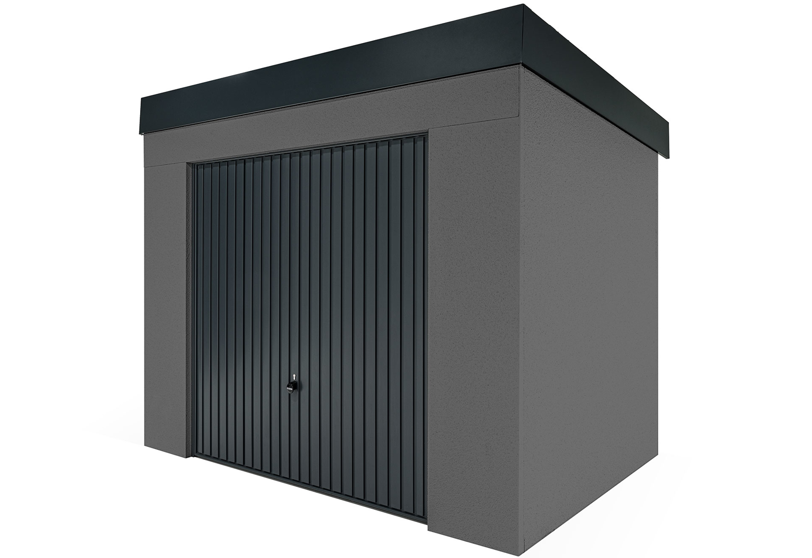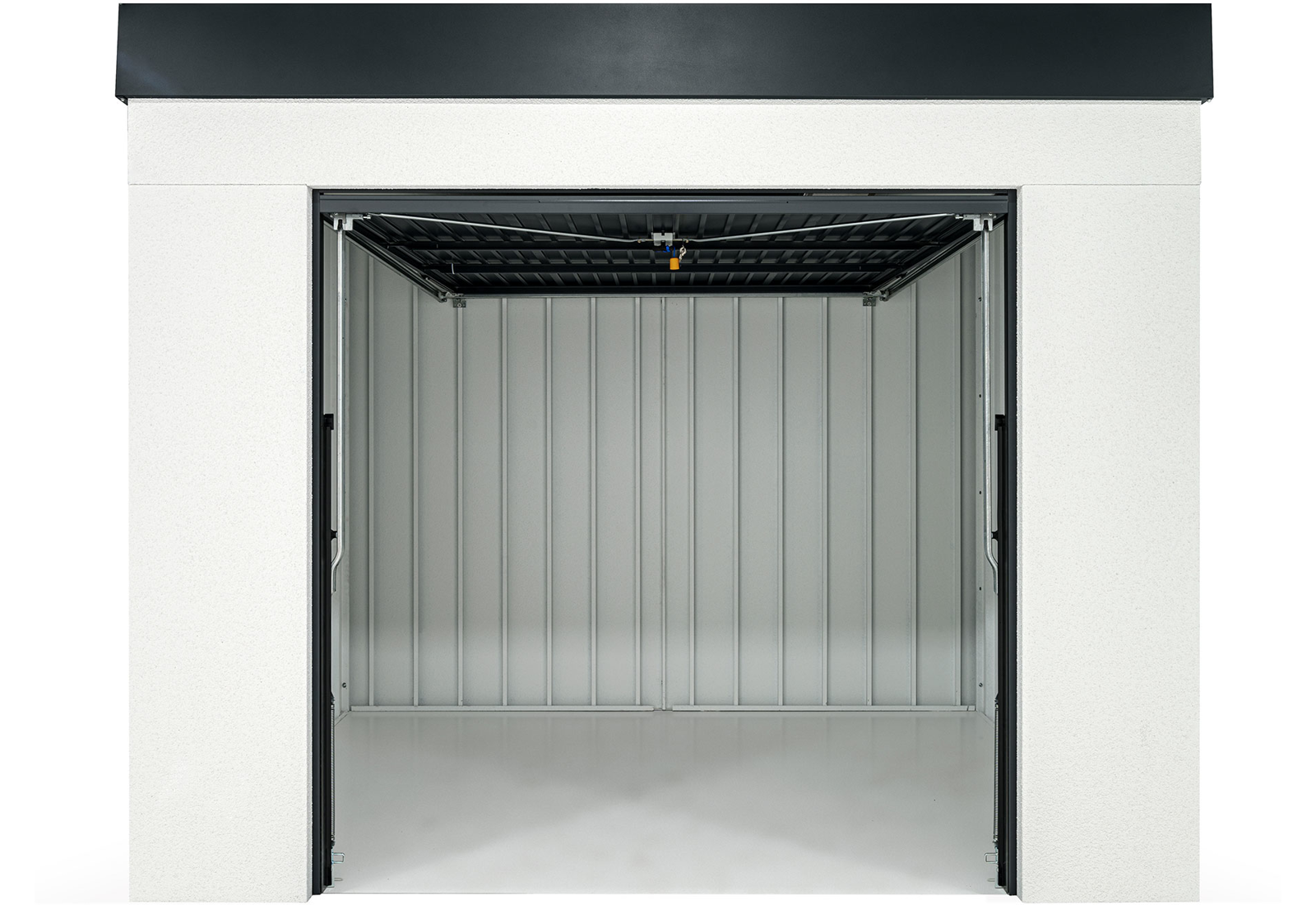 Ihre Traumgarage gibt es wirklich! Ein geräumiges Gartenhaus mit hochwertigen Hörmann-Garagentoren, integrierter Beleuchtung und Solarbetrieb. Die segmentierten Torflügel falten sich nach innen und sparen so Platz. Das extrem leise Öffnen und Schließen der Tore ist ein zusätzlicher Bonus.