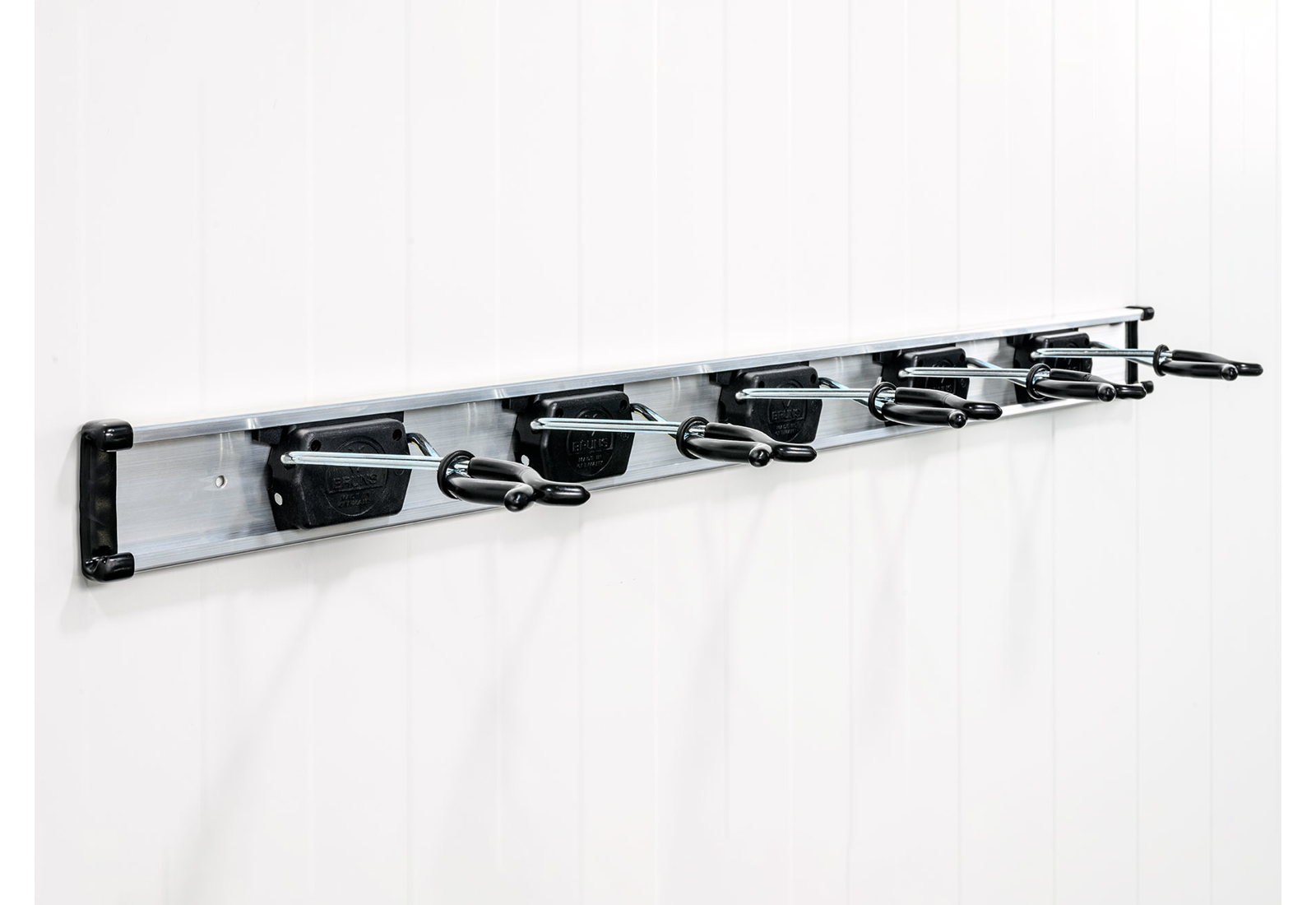 Set des Aufhängesystems für Werkzeuge – mit einer Trägerschiene von 0,75 m Länge und fünf universellen Halterungen.
