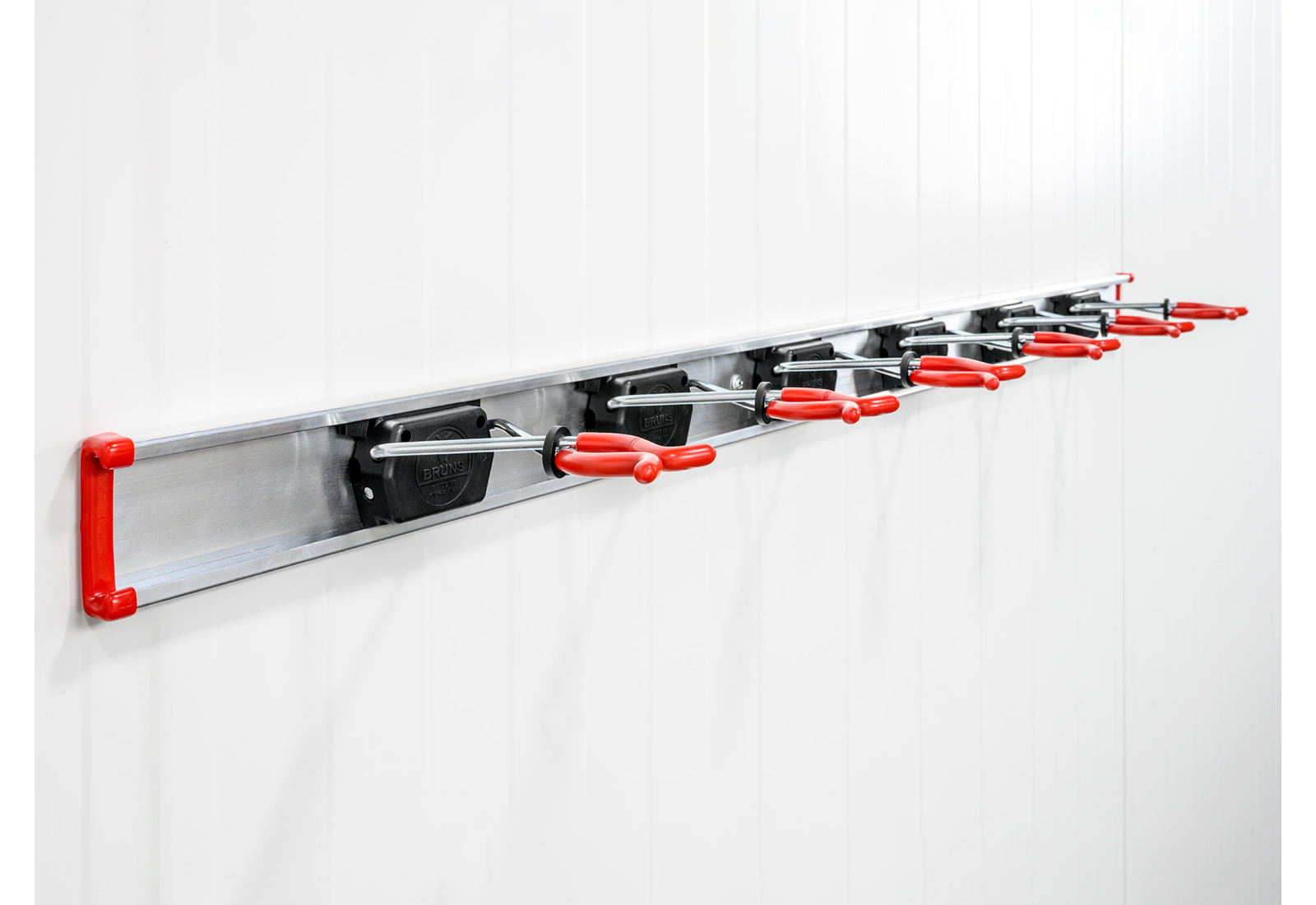 Werkzeug-Aufhängesystem-Set – mit einer 1 m langen Trägerschiene und sechs universellen Halterungen.